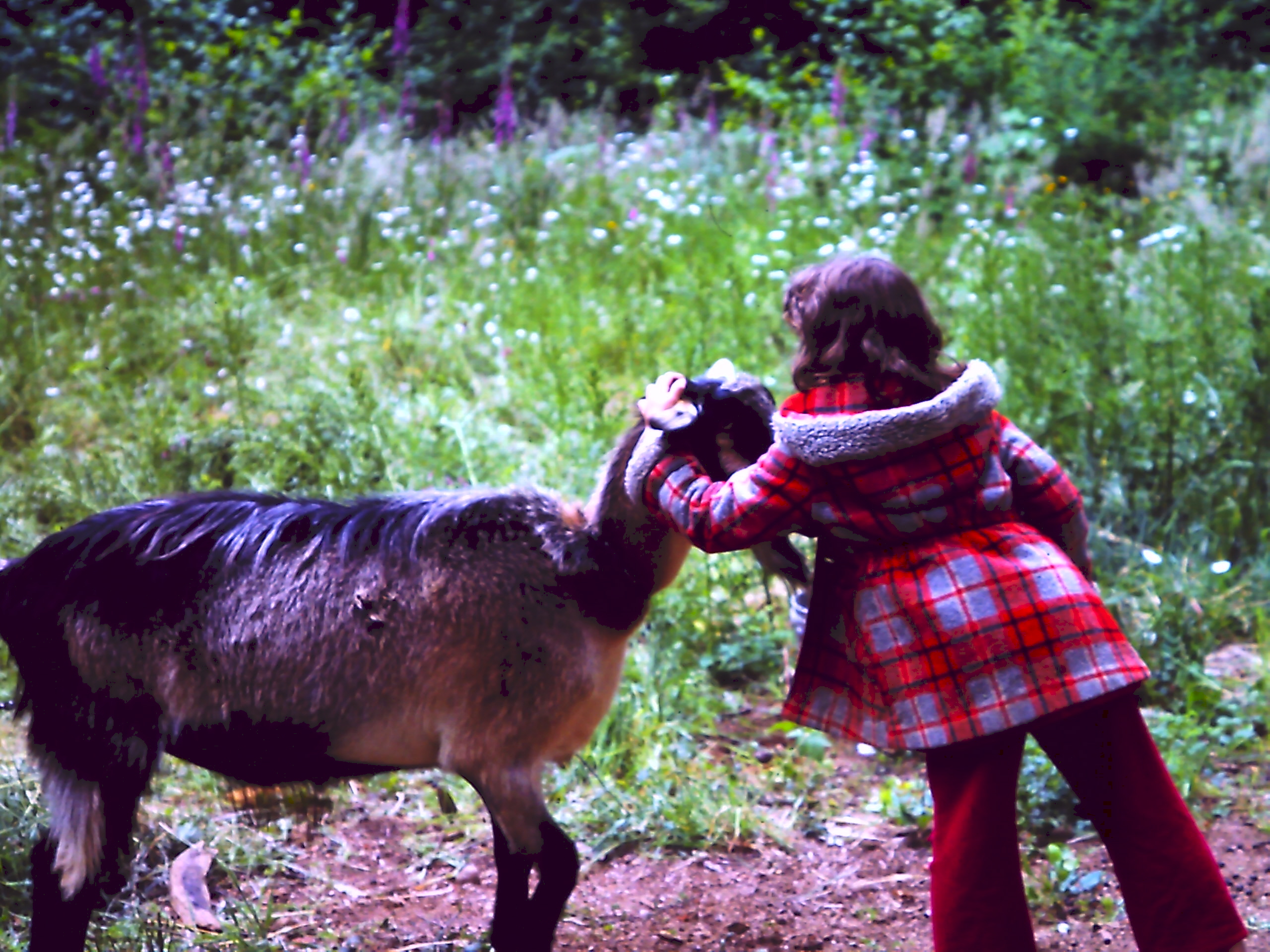 Our girls loved Mr. Goatley. They would put their hands on his head and push or let him push them from behind . He loved the game. My younger daughter had to be really careful because she was smaller; if she wasn’t, he would swing his head and hit her and knock her over. He did that once to me while I was giving him oats and while I didn’t go over, I felt as if he knocked my head off my shoulders!